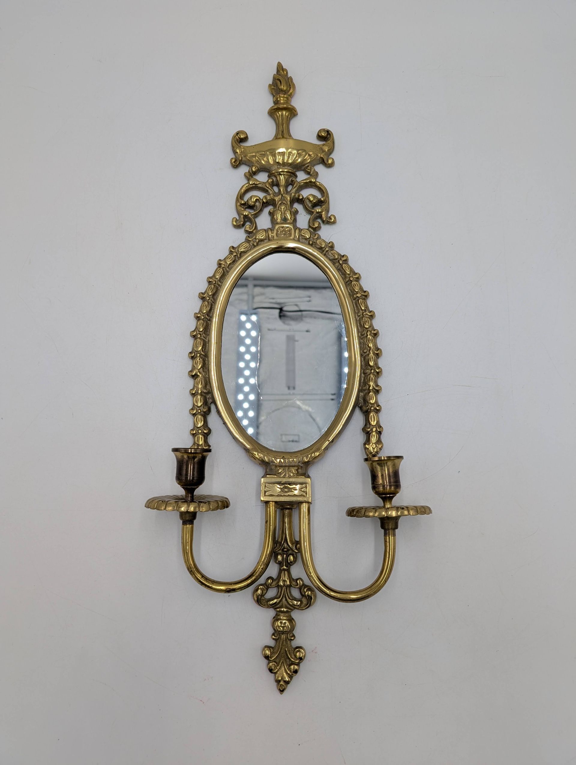 Mid-century oval mirror, two-candle hanging brass wall sconce. Superficial scratch on mirror.