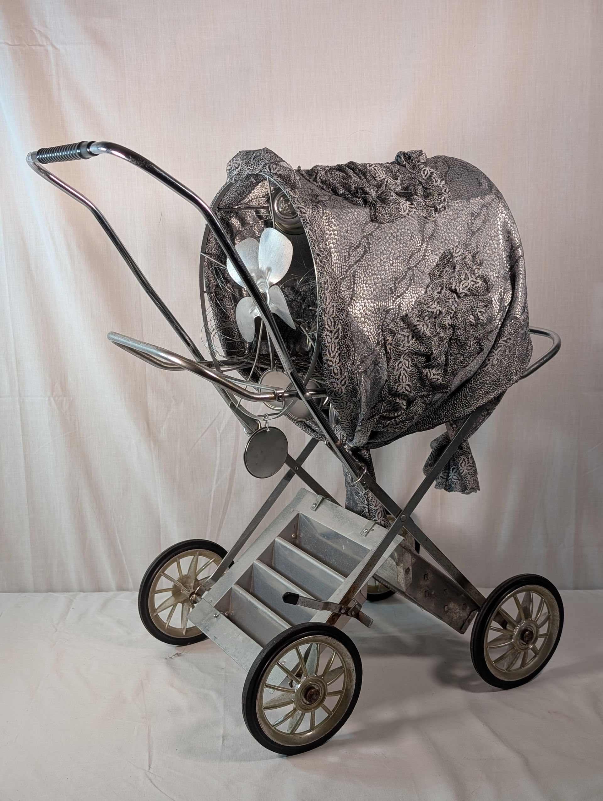 Really cool steampunk baby carriage assemblage / statue by Catherine Hale. Materials: metal and fabric